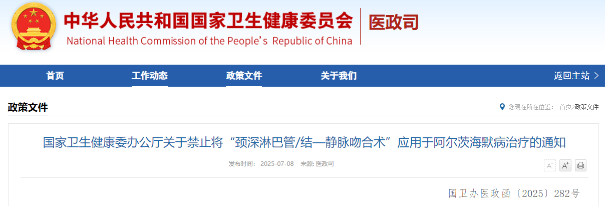 近来争议不断的一项“阿尔茨海默病手术”,被紧急叫停了!7月8日,国家卫健委网站发文,禁止将“颈深淋巴管/结—静脉吻合术”(LVA)应用于阿尔茨海默病(AD)治疗。